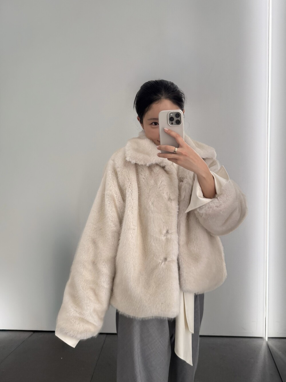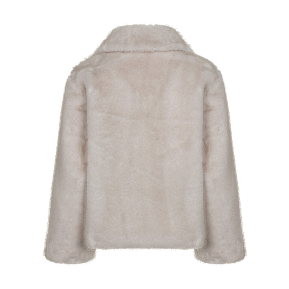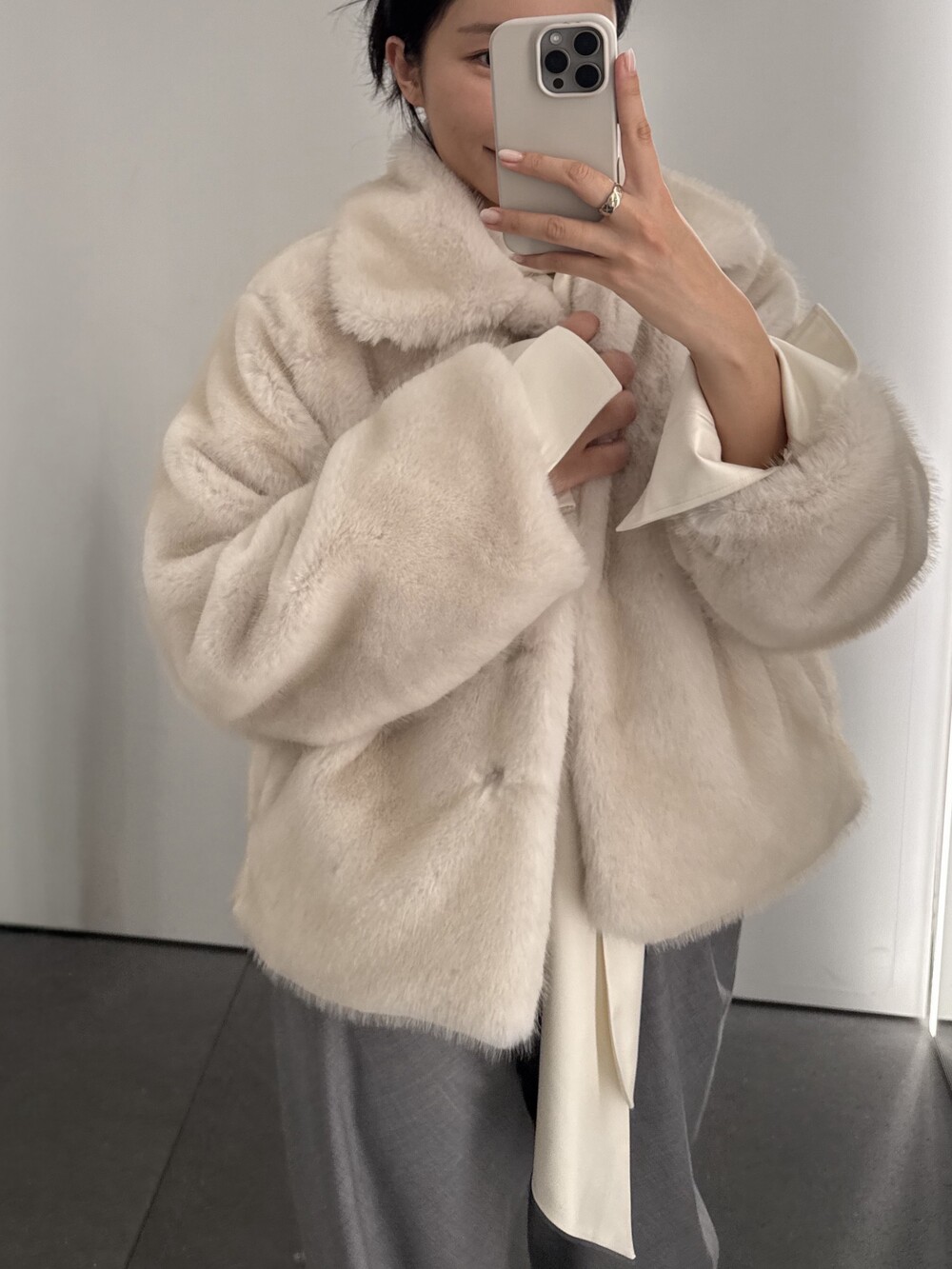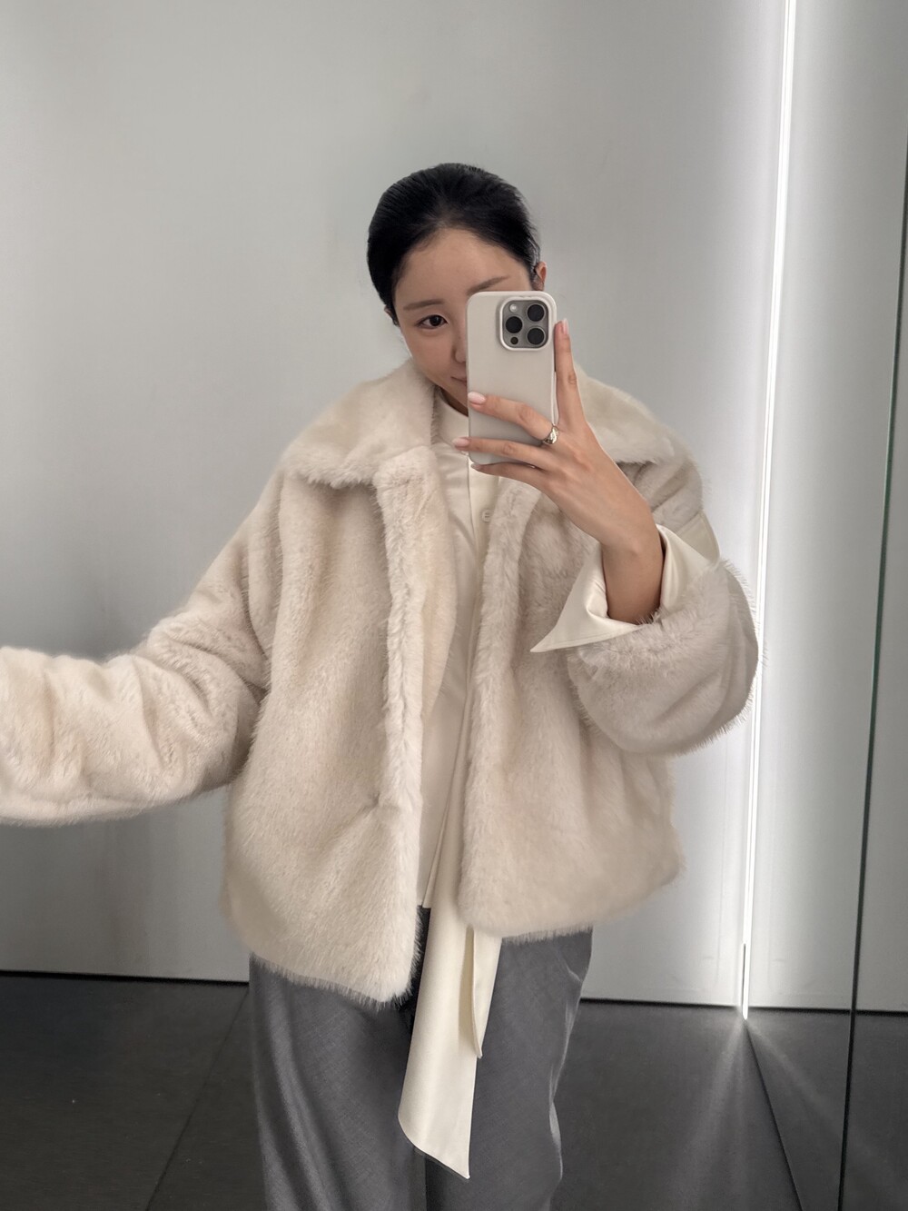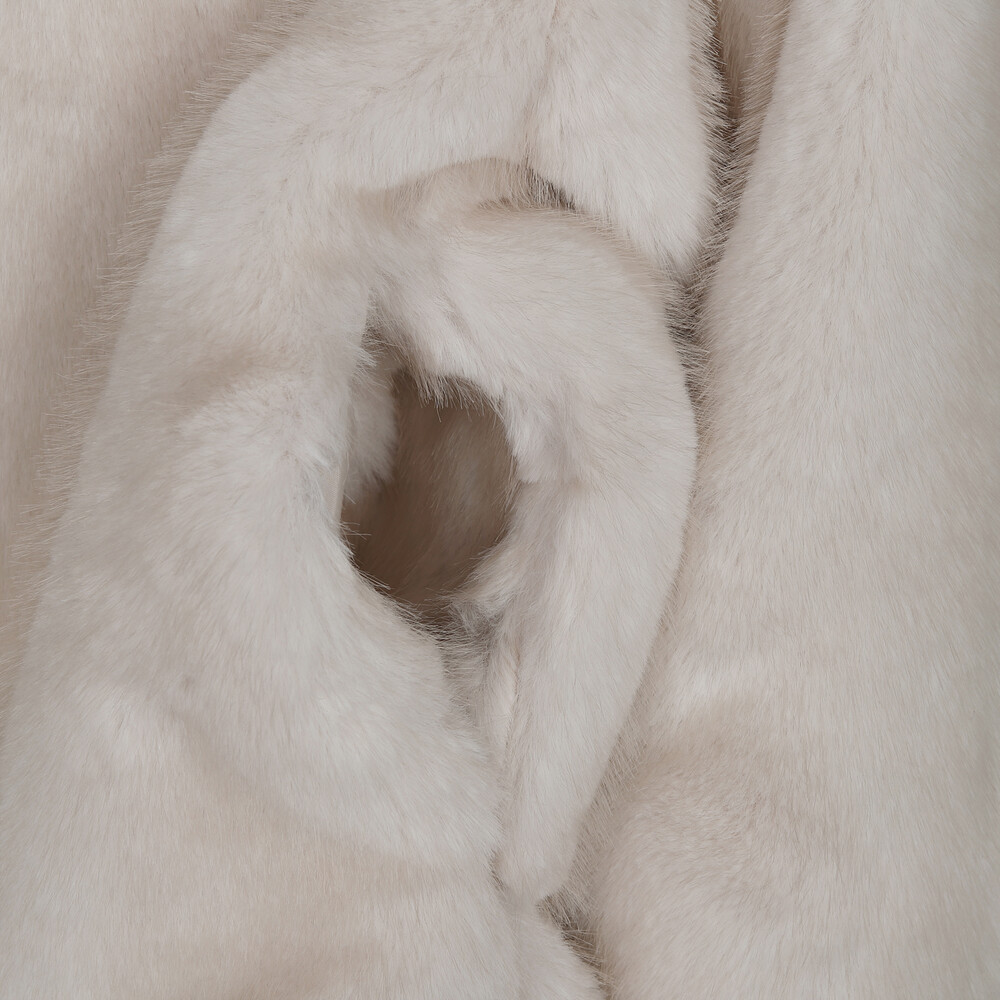 밀도감 있는 퍼 텍스처가 따뜻하고 안정적으로 떨어지는 겨울 아우터 실루엣을 완성합니다.