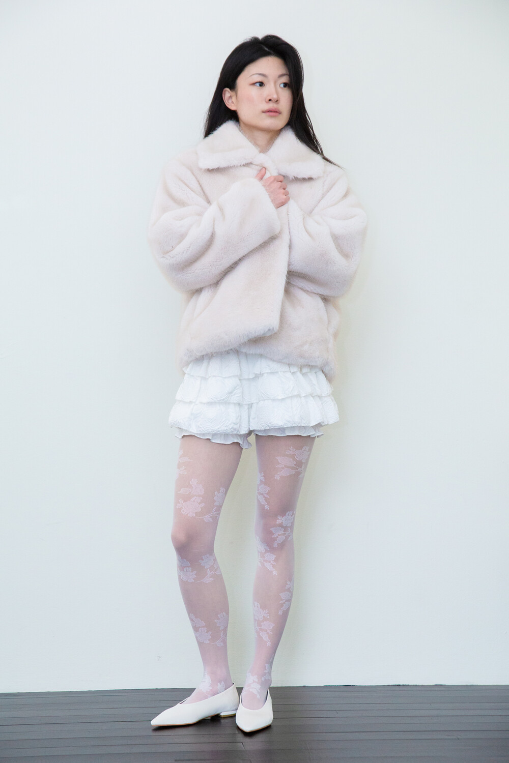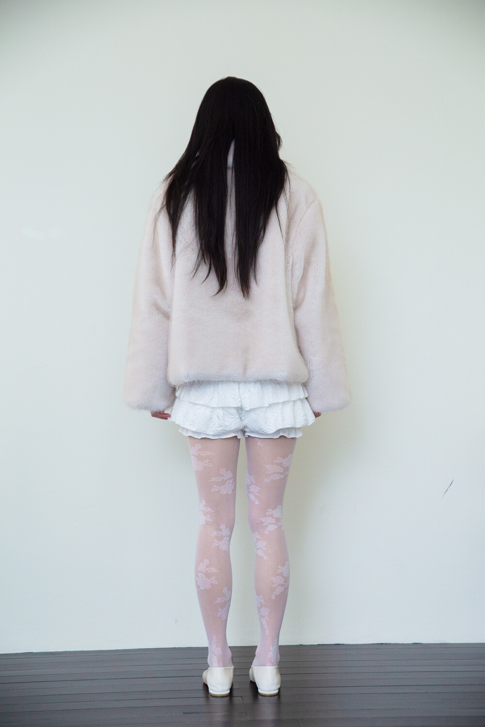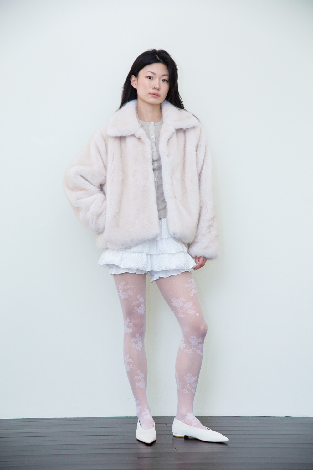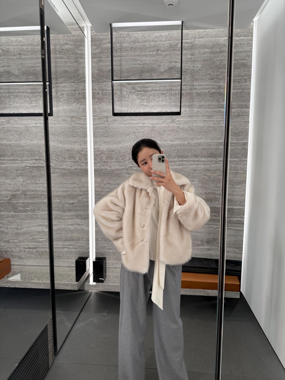 밀도감 있는 퍼 텍스처가 따뜻하고 안정적으로 떨어지는 겨울 아우터 실루엣을 완성합니다.