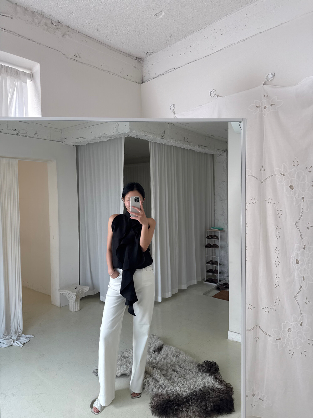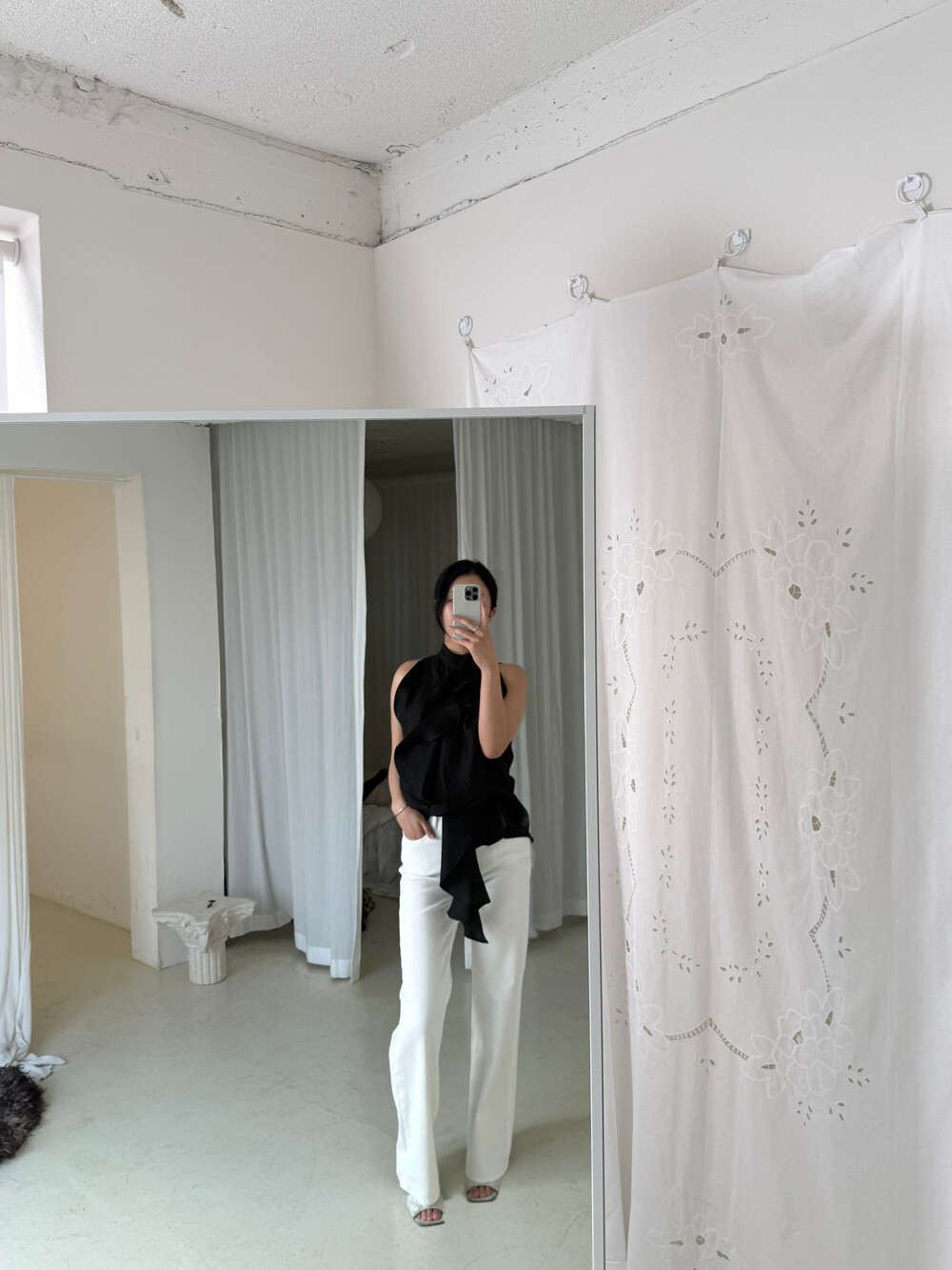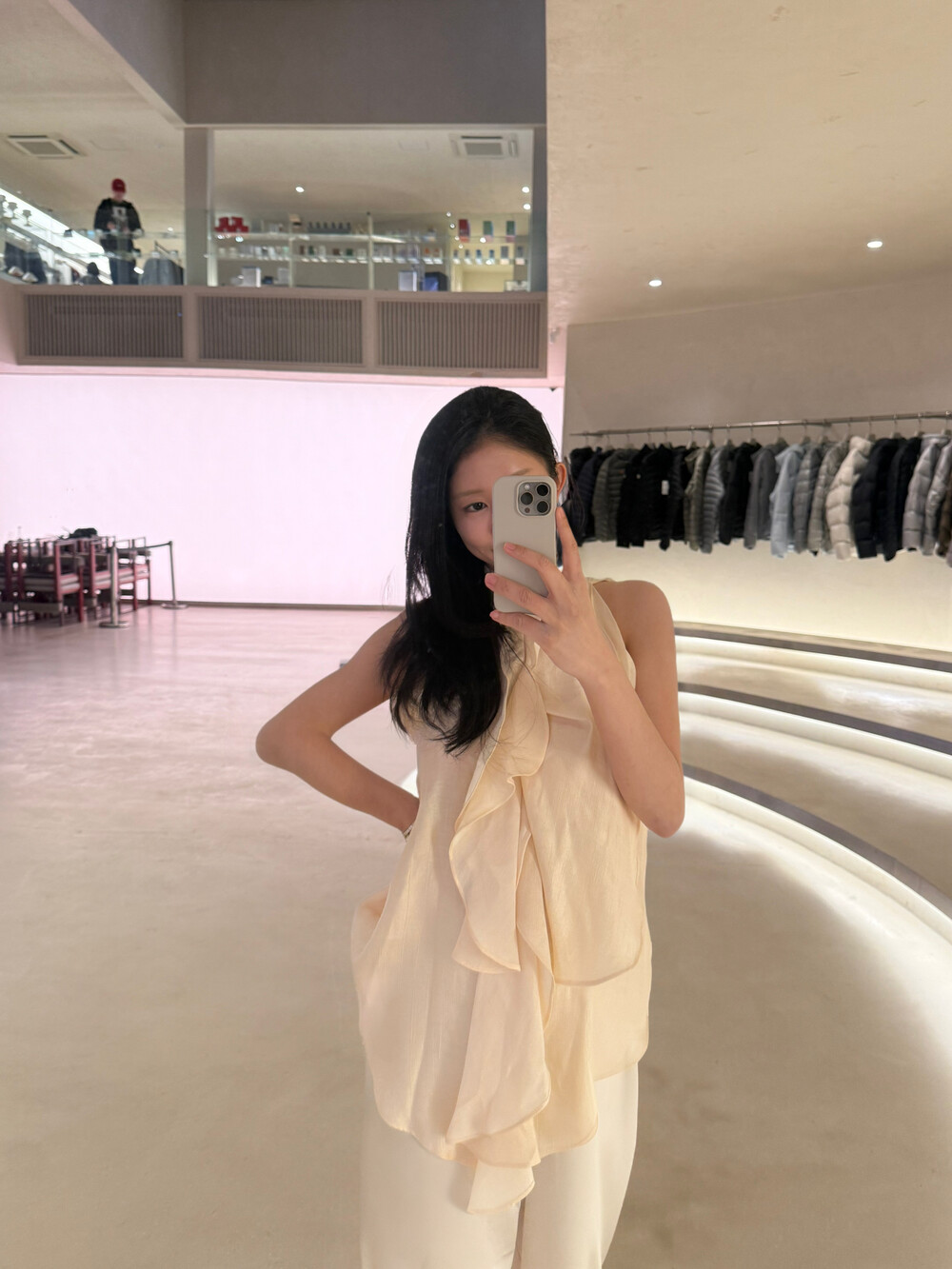 러플을 ‘장식’으로 쓰기보다, 원단의 흐름과 결을 살려 구조적으로 설계하여