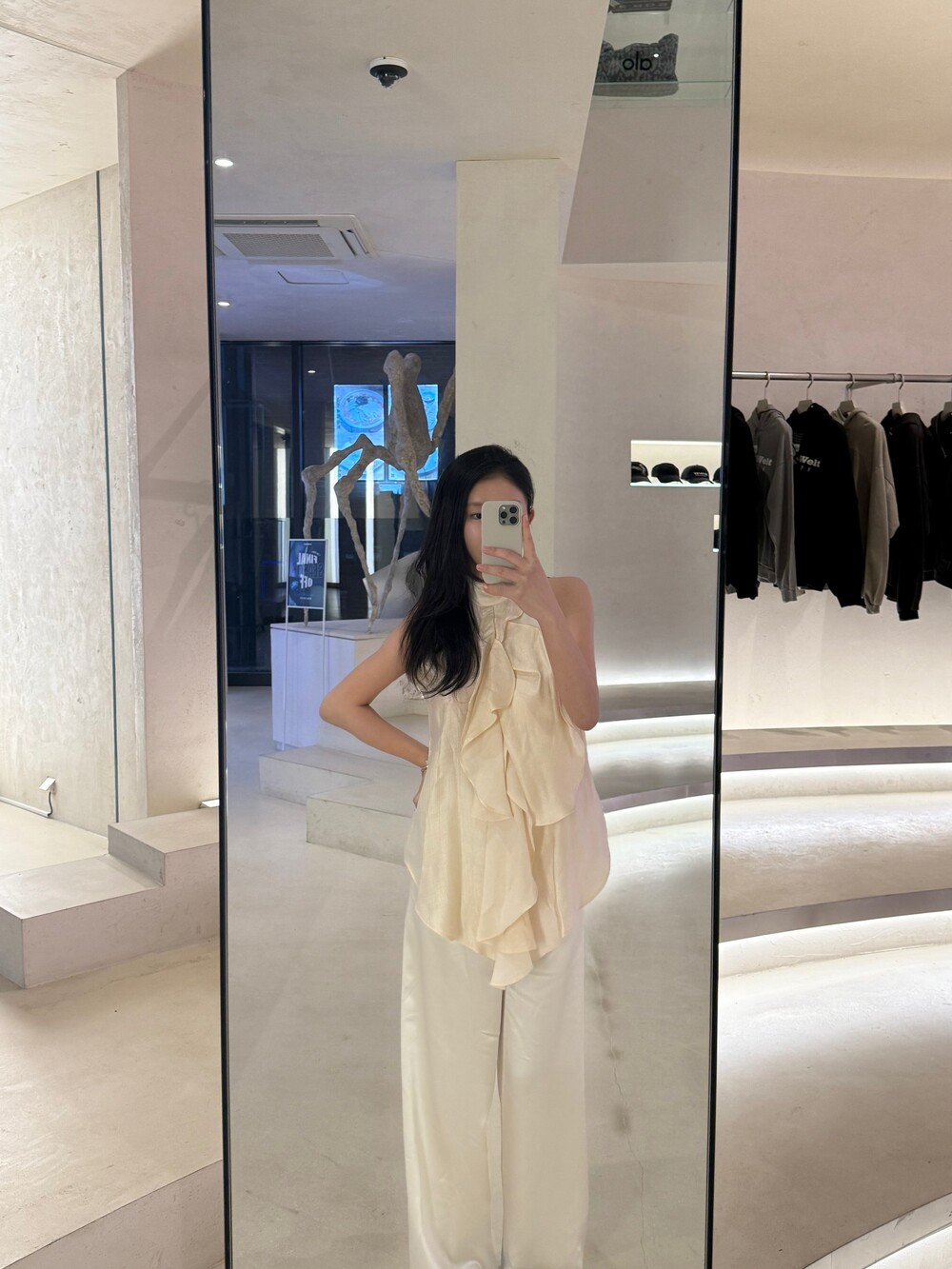 입기 전 스팀 다리미로 한 번 정리해 주면 한층 더 정제된 분위기로 연출됩니다.