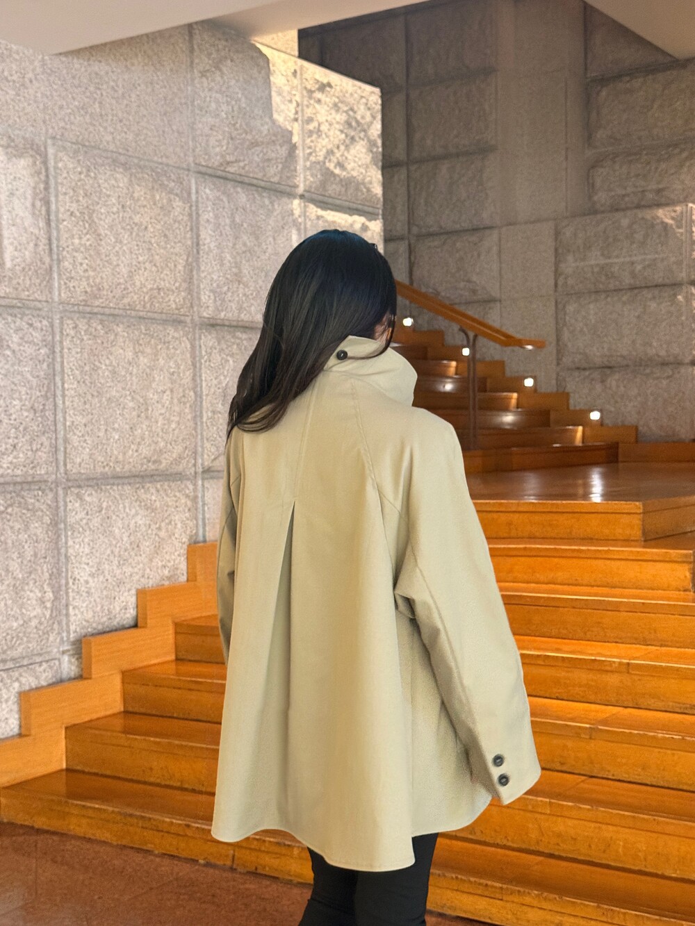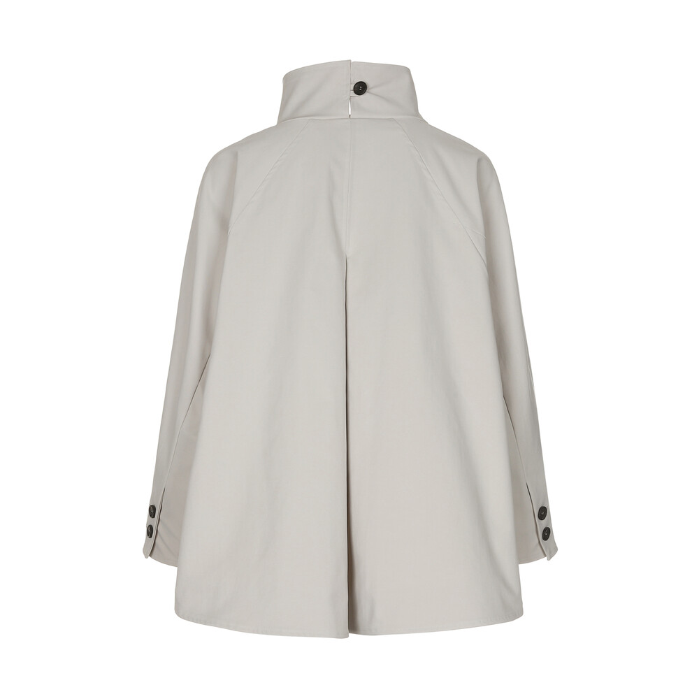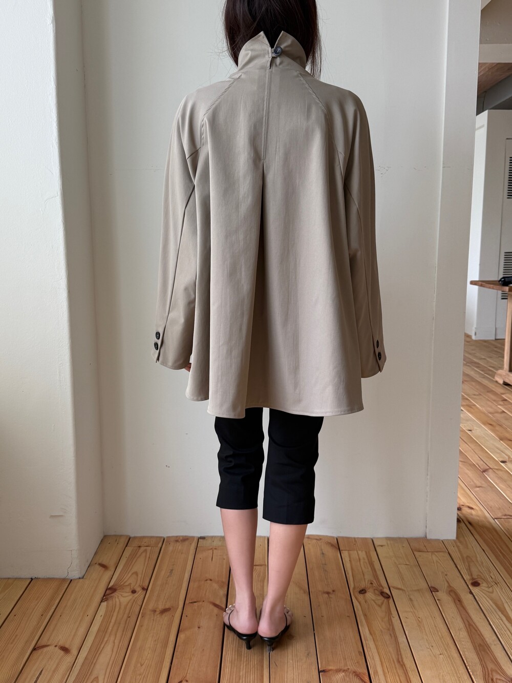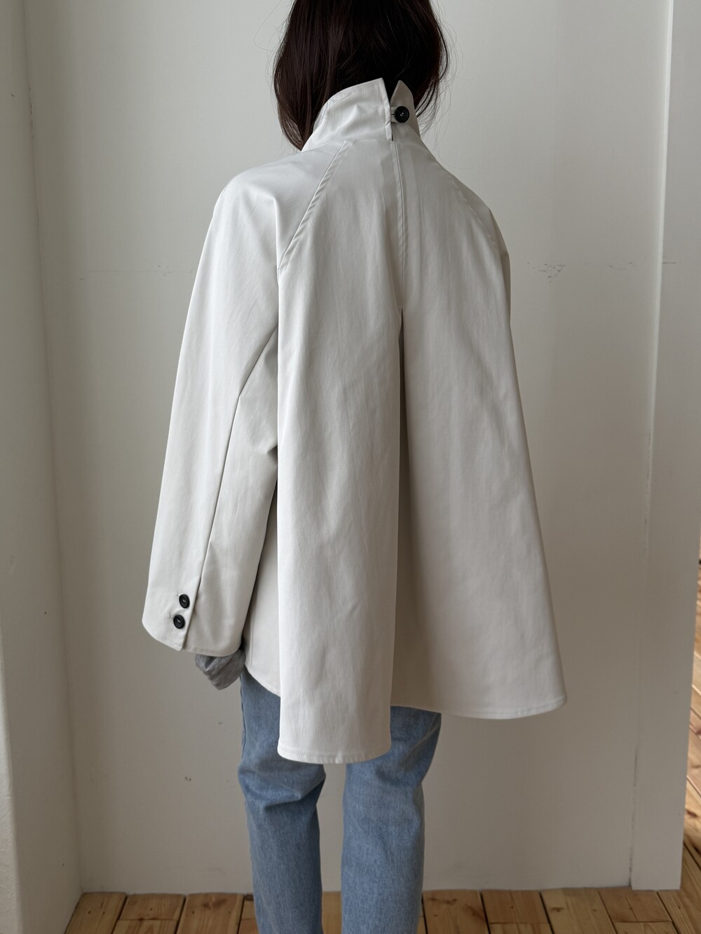 여성스러운 케이프 스타일의 실루엣과 뒷면의 단정한 하이넥 디자인을 동시에 담은 제품으로,
