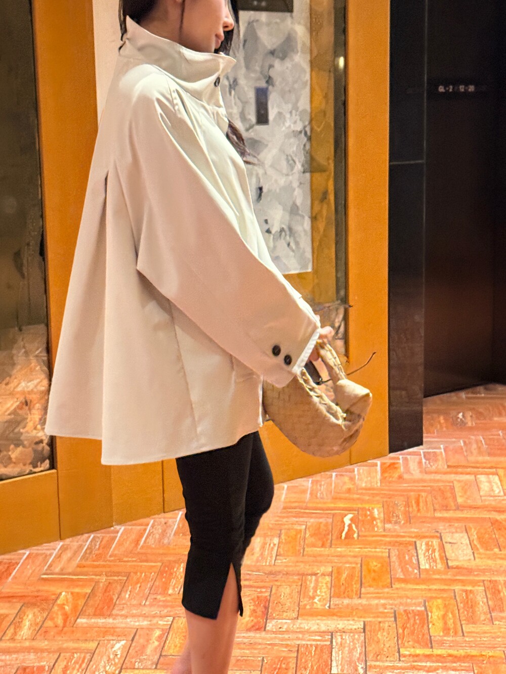 기장: 엉덩이 중간 정도에 떨어지는 하프 기장으로, 팬츠와 스커트 모두 균형 있게 매치되는 길이입니다.