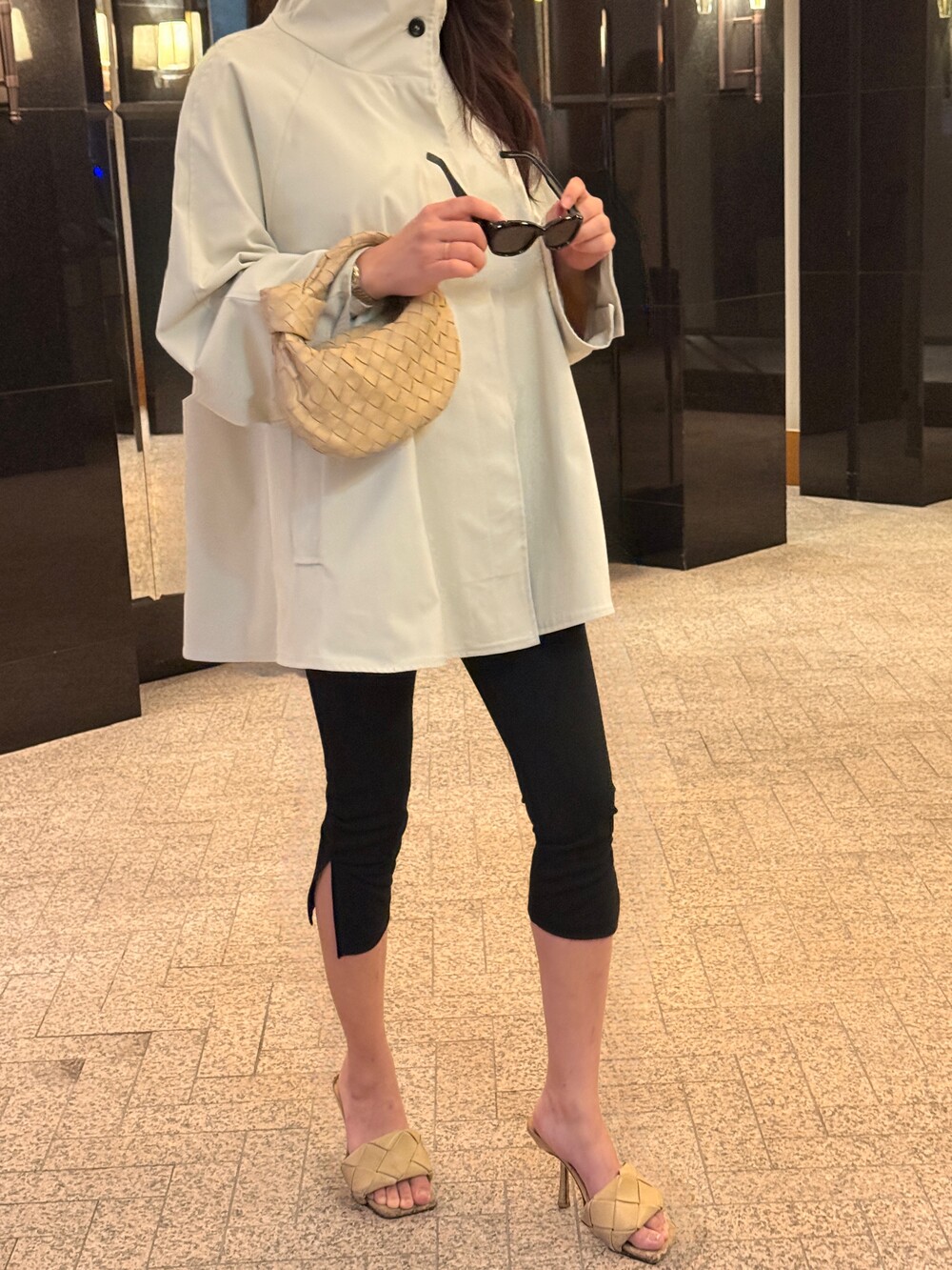 실루엣: 여성스러운 케이프 형태의 패턴을 기반으로 제작되어몸을 자연스럽게 감싸듯 떨어지는 부드러운 라인이 특징입니다.