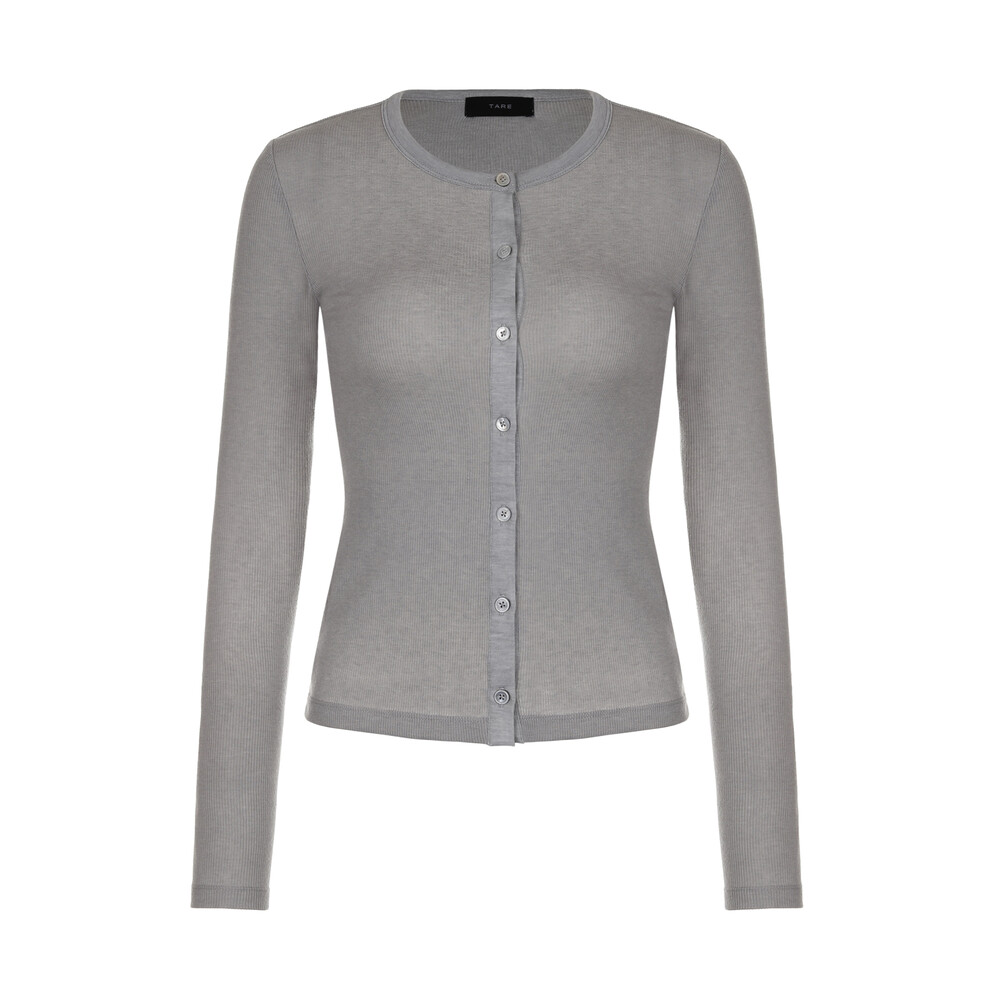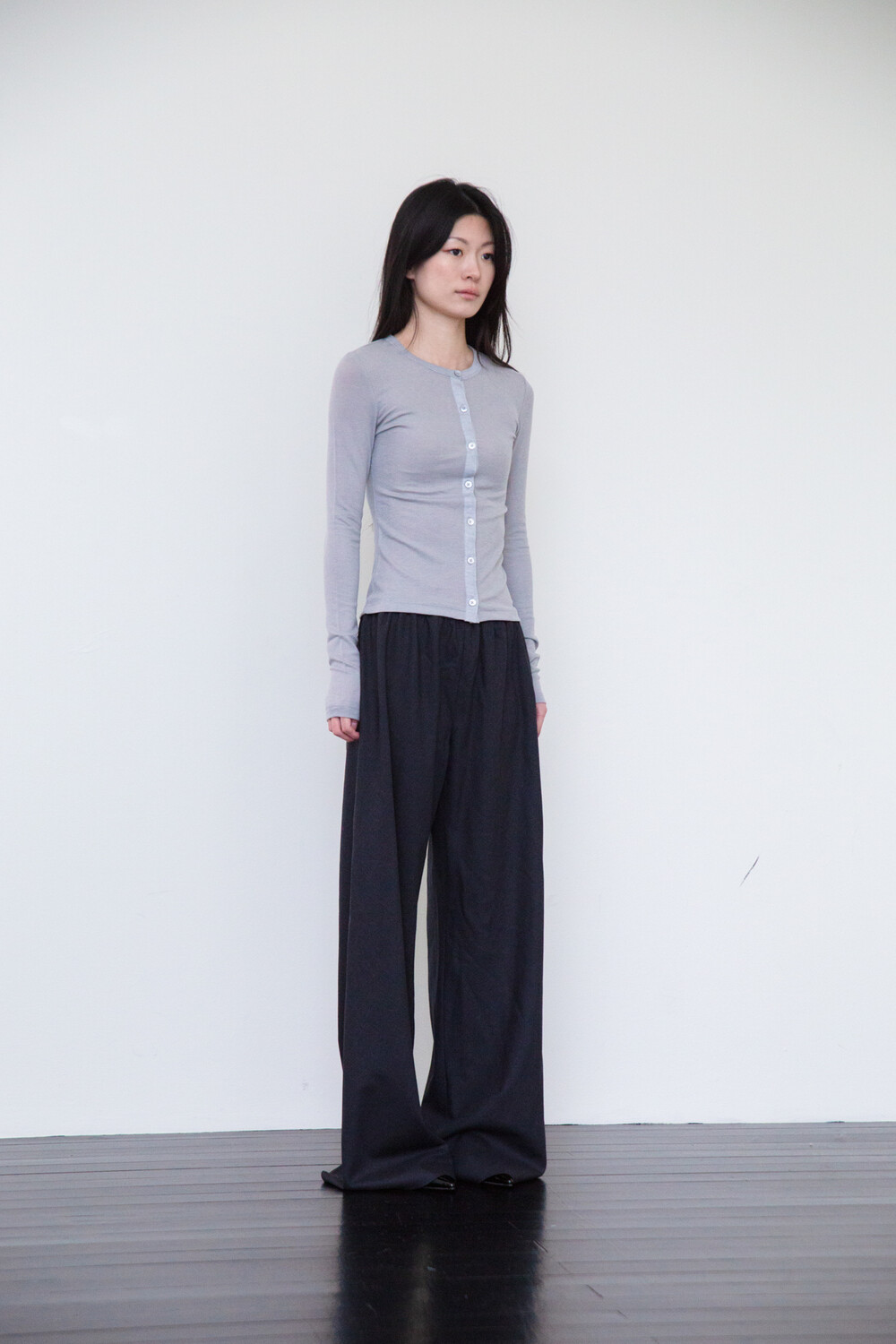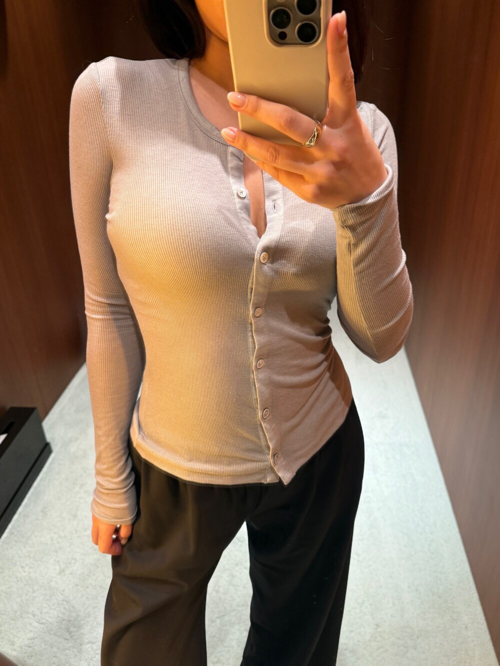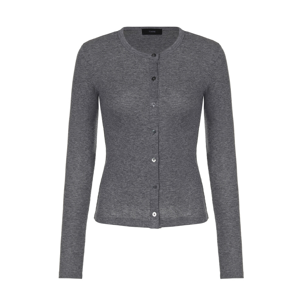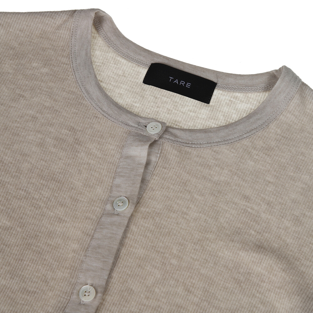 테어의 시그니처 감성과 뉴트럴 무드를 담아낸 Wool Tencel Ribbed Button Top은