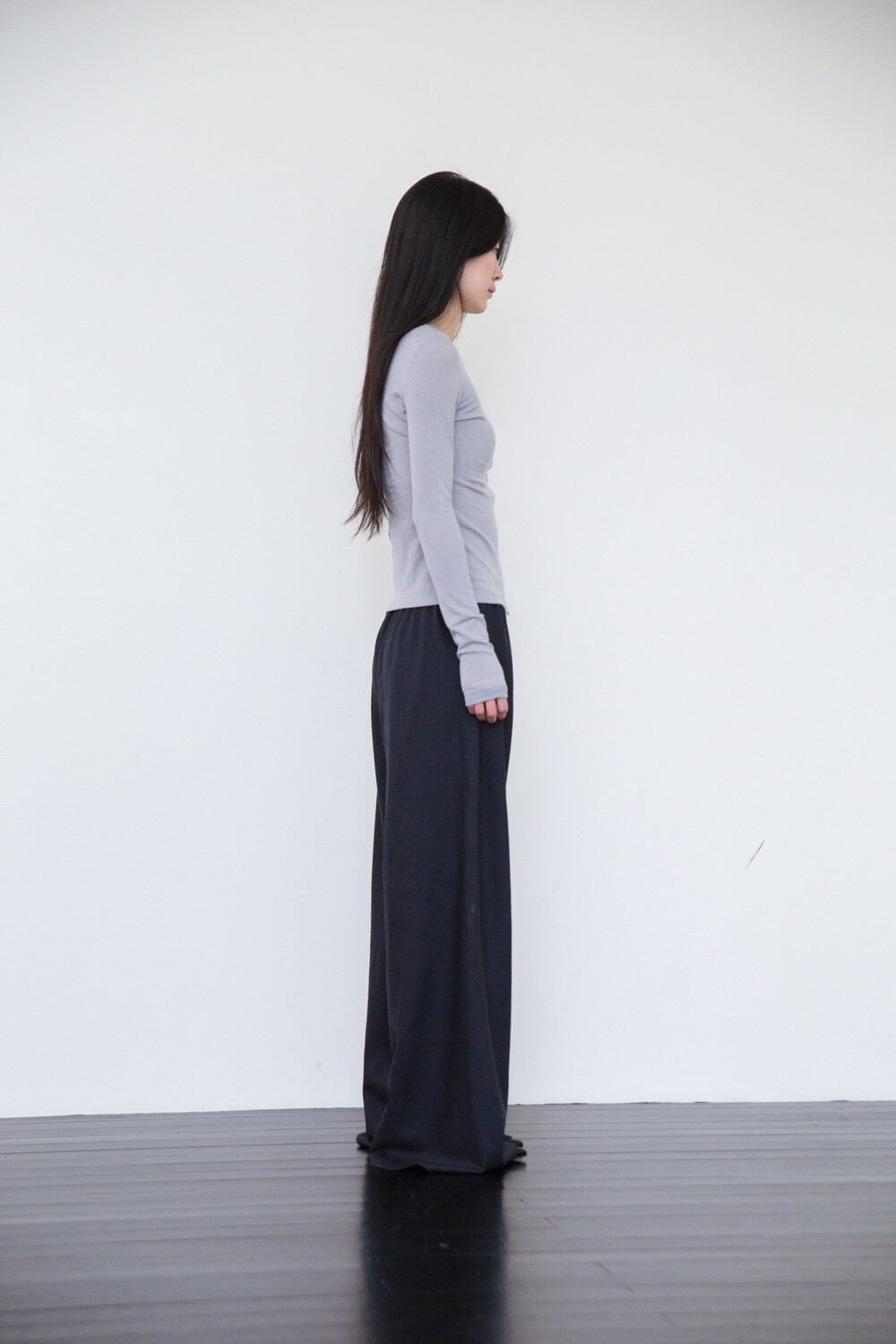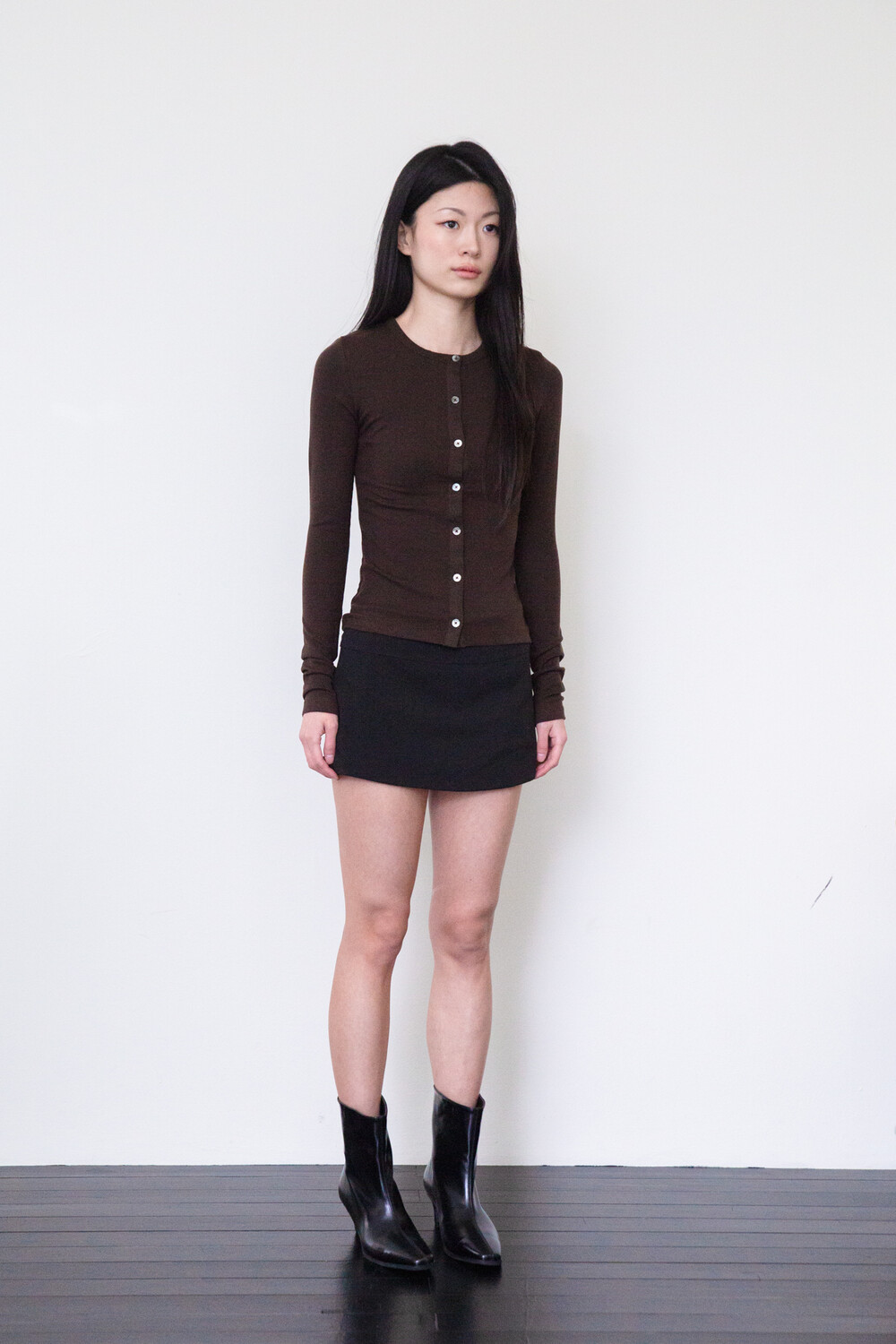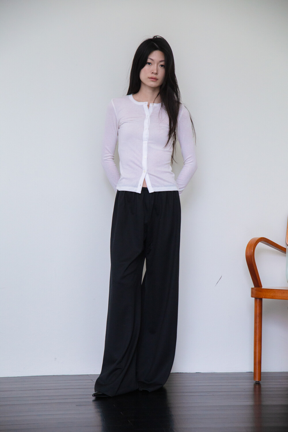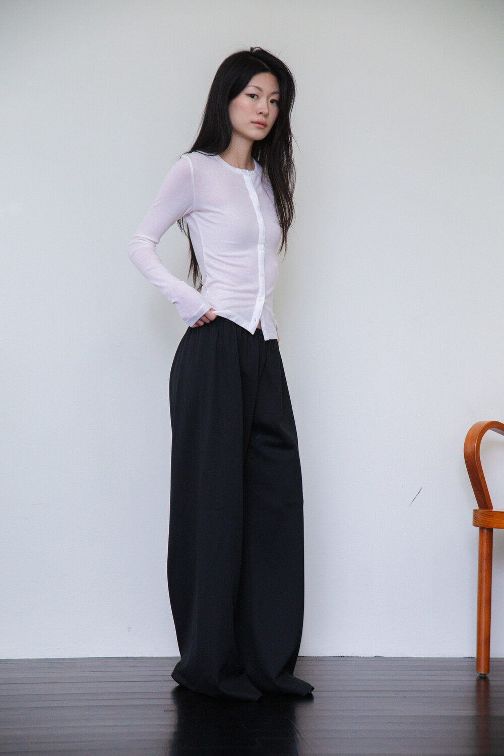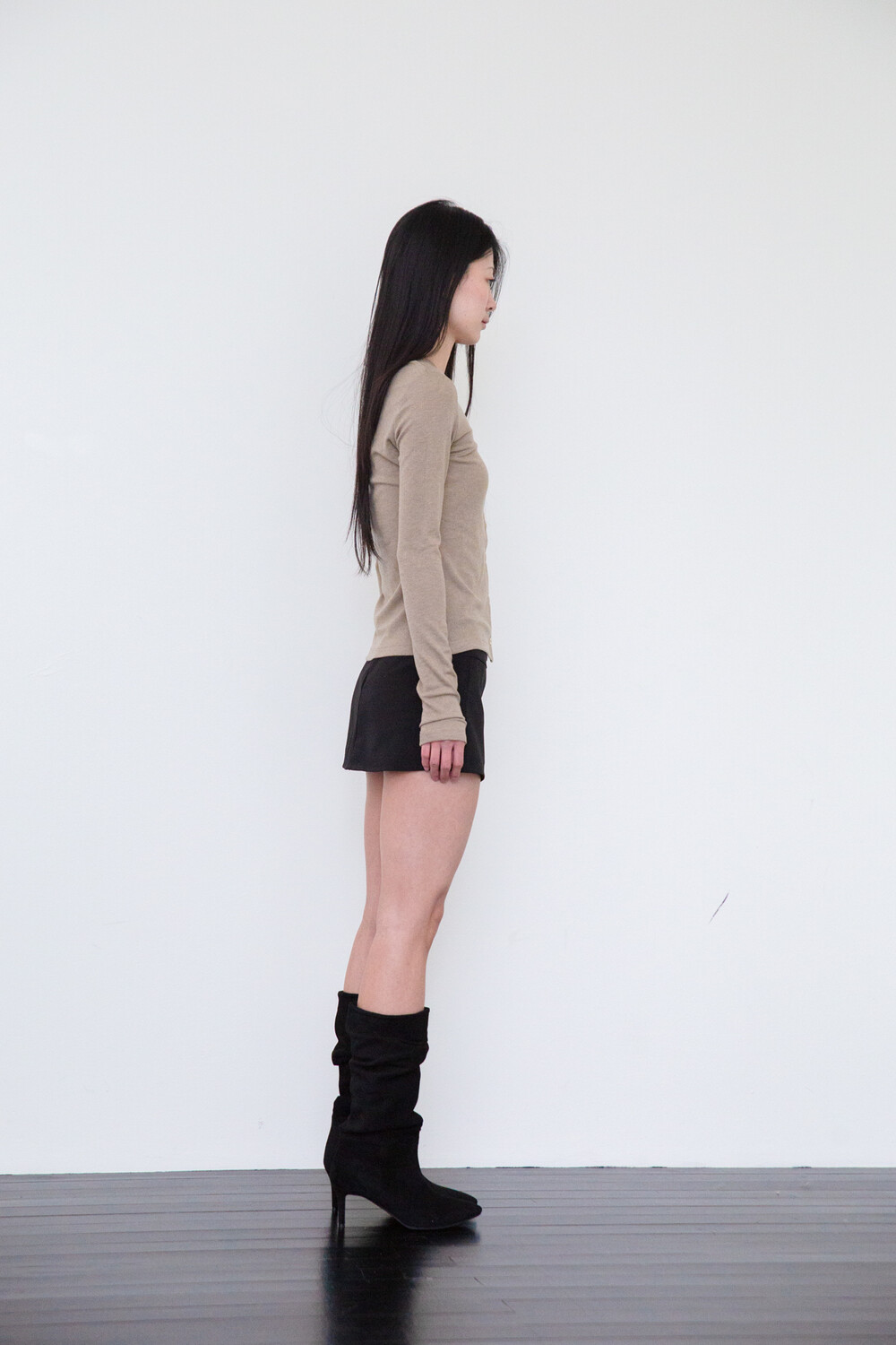 테어의 시그니처 감성과 뉴트럴 무드를 담아낸 Wool Tencel Ribbed Button Top은
