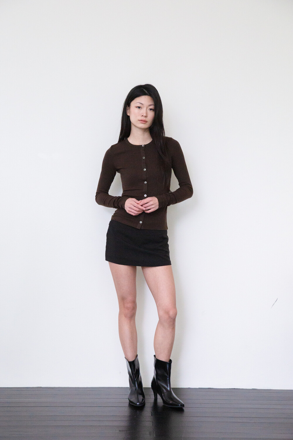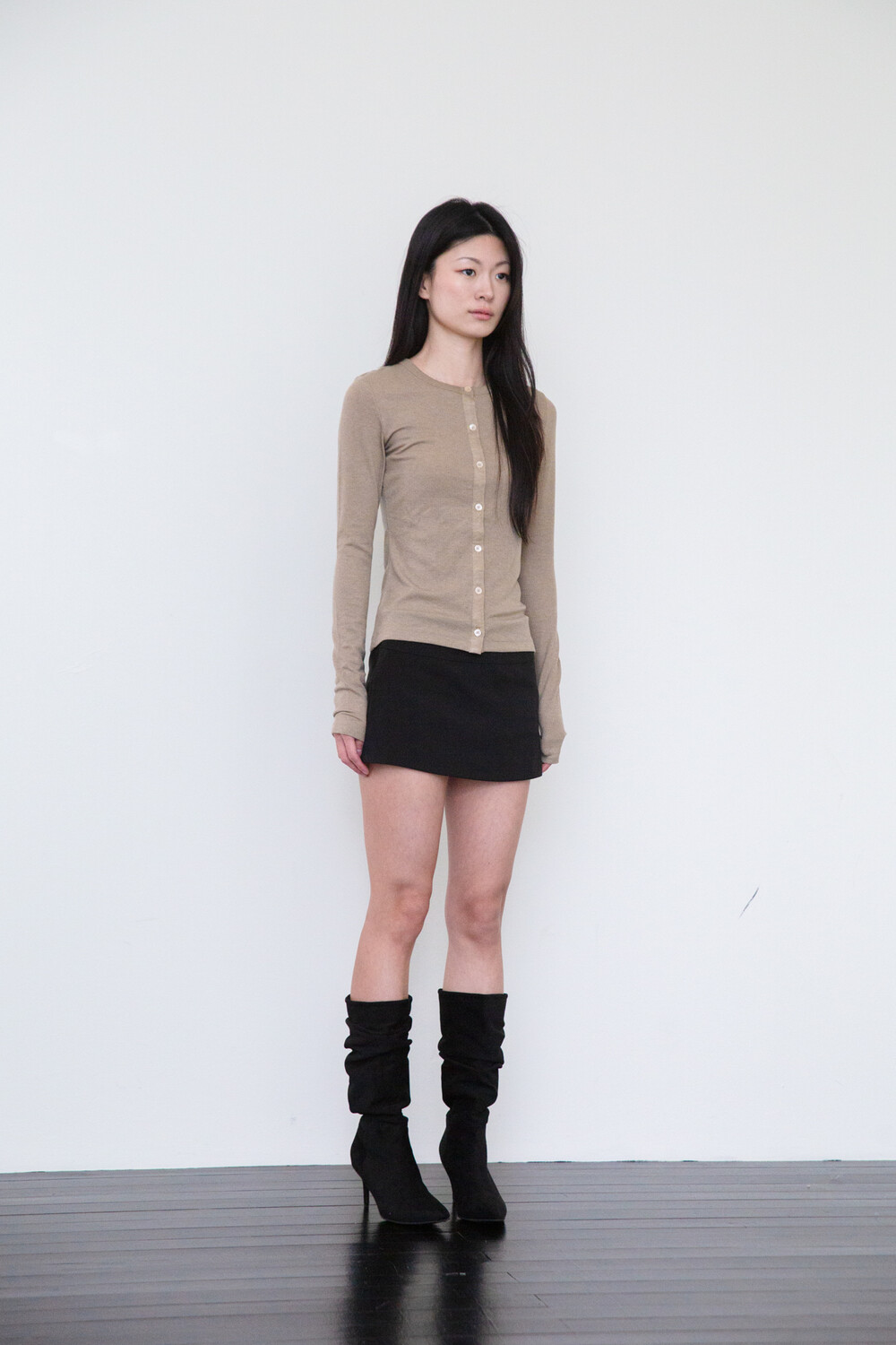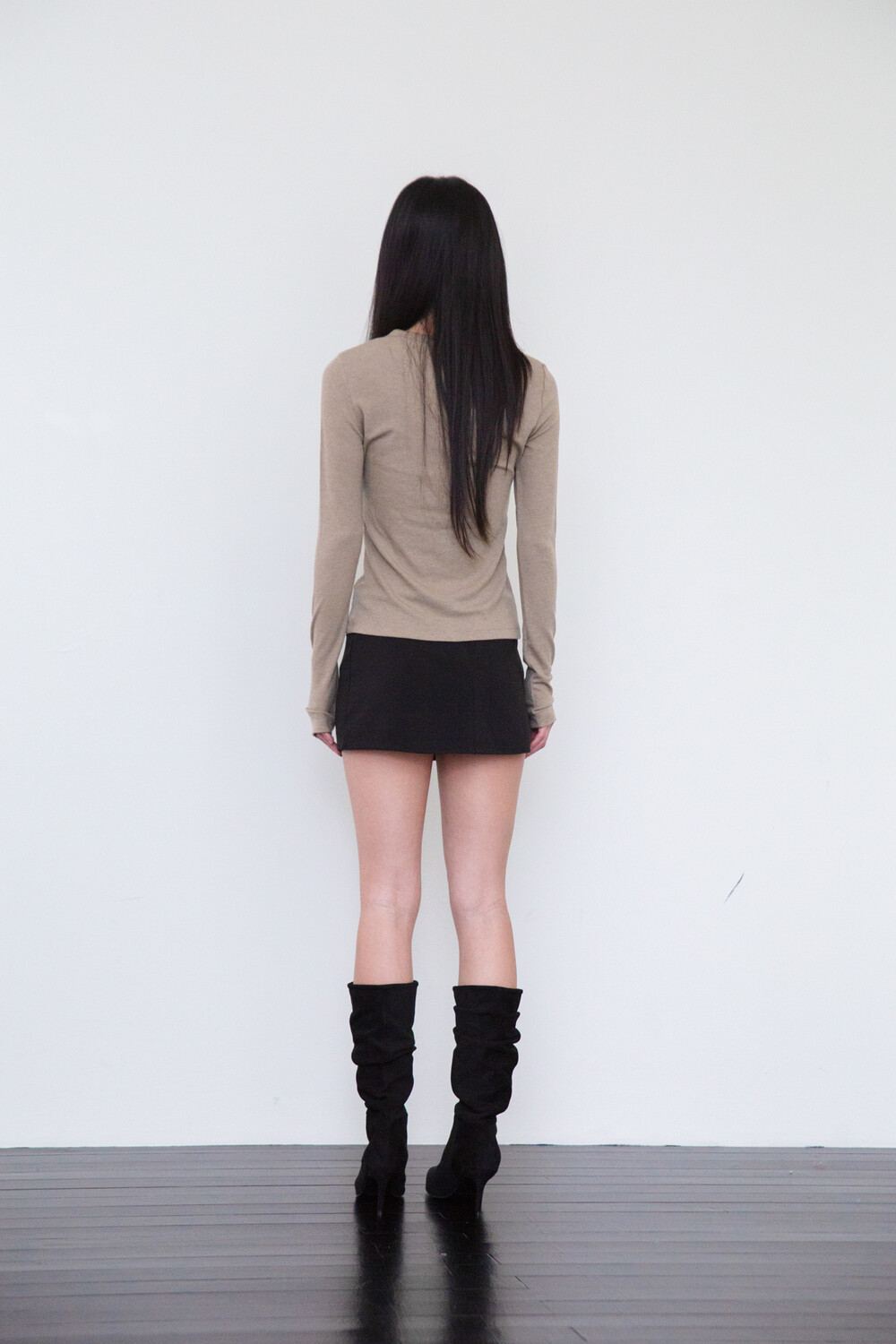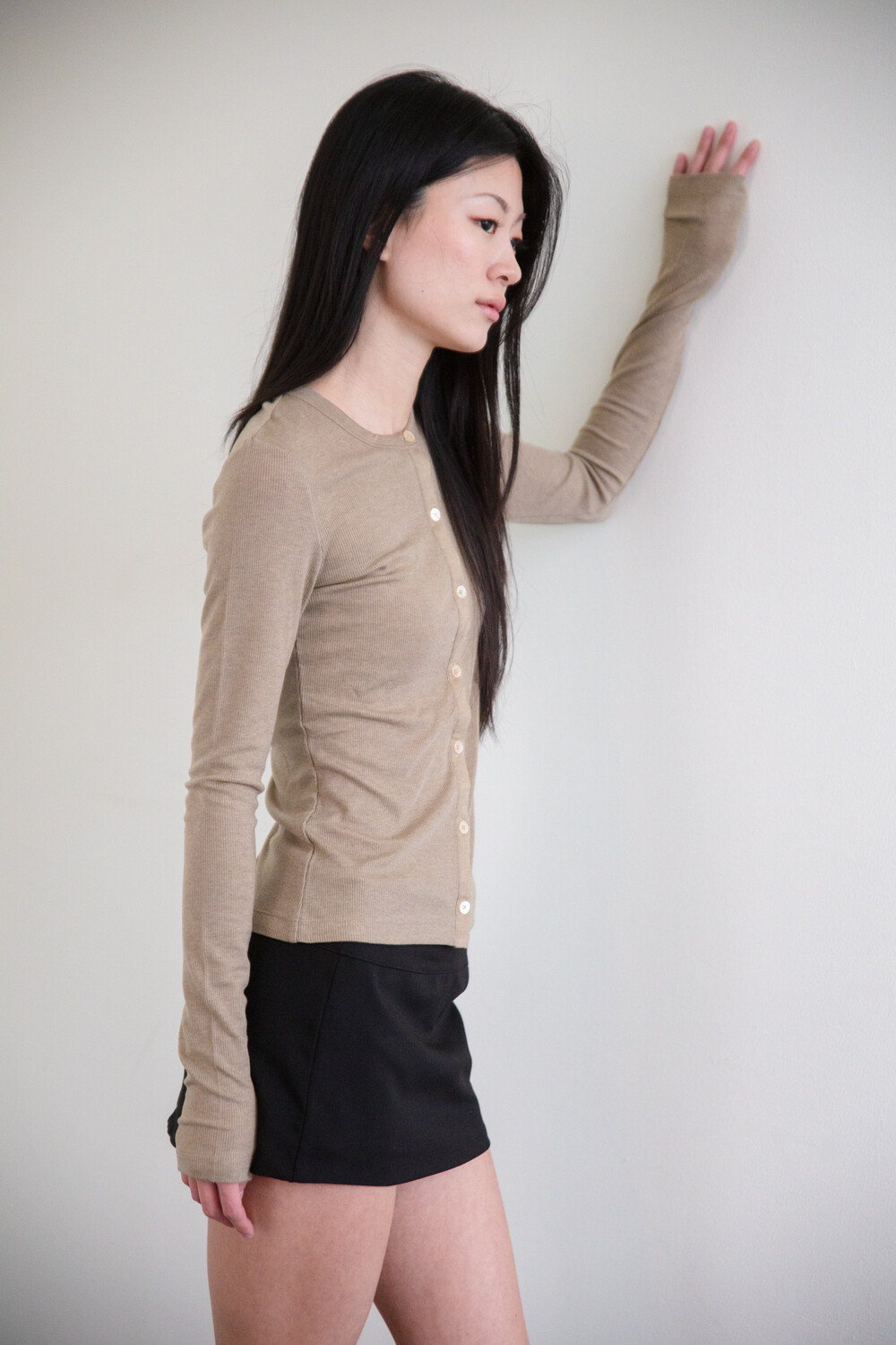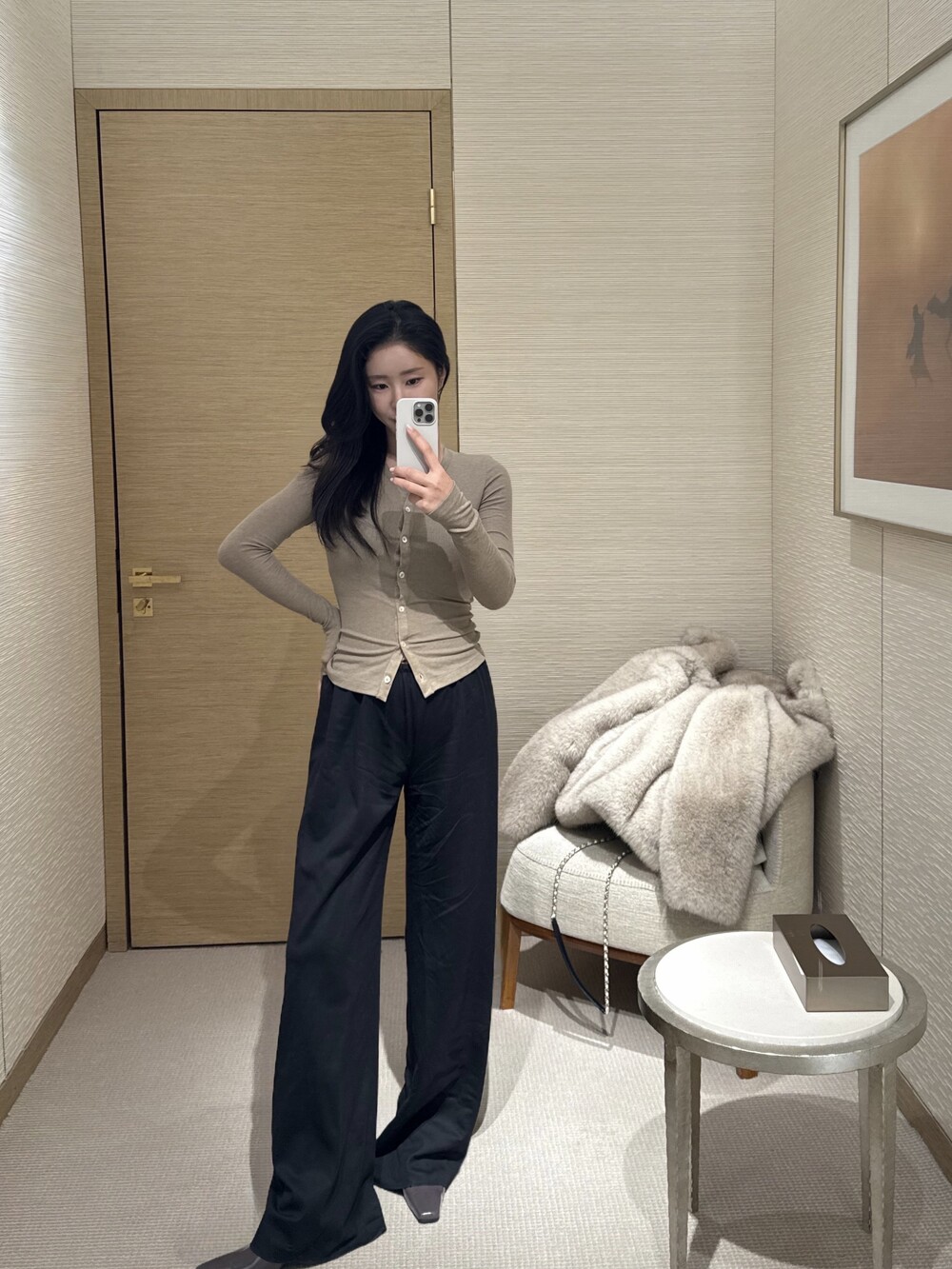테어의 시그니처 감성과 뉴트럴 무드를 담아낸 Wool Tencel Ribbed Button Top은