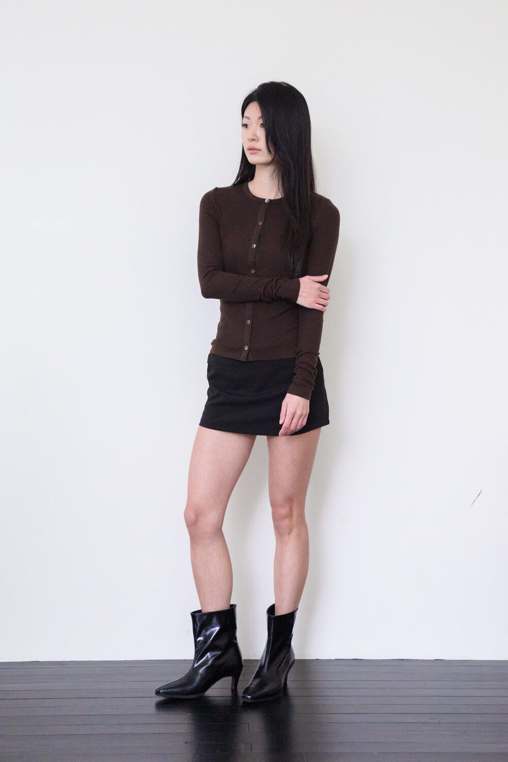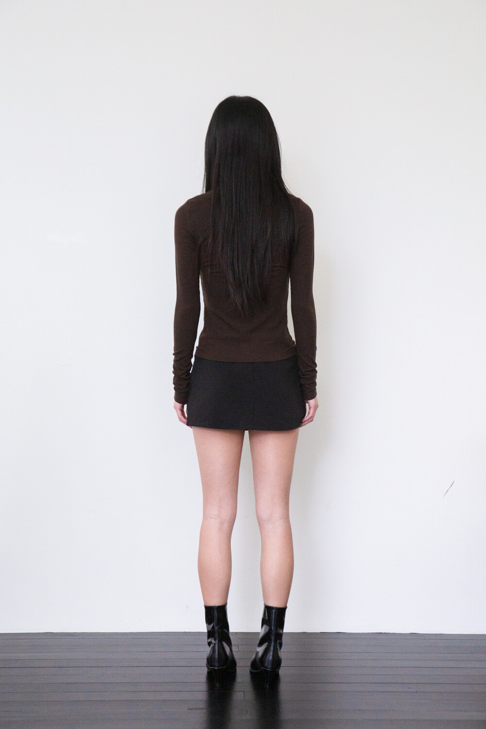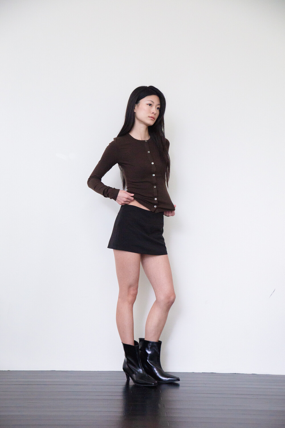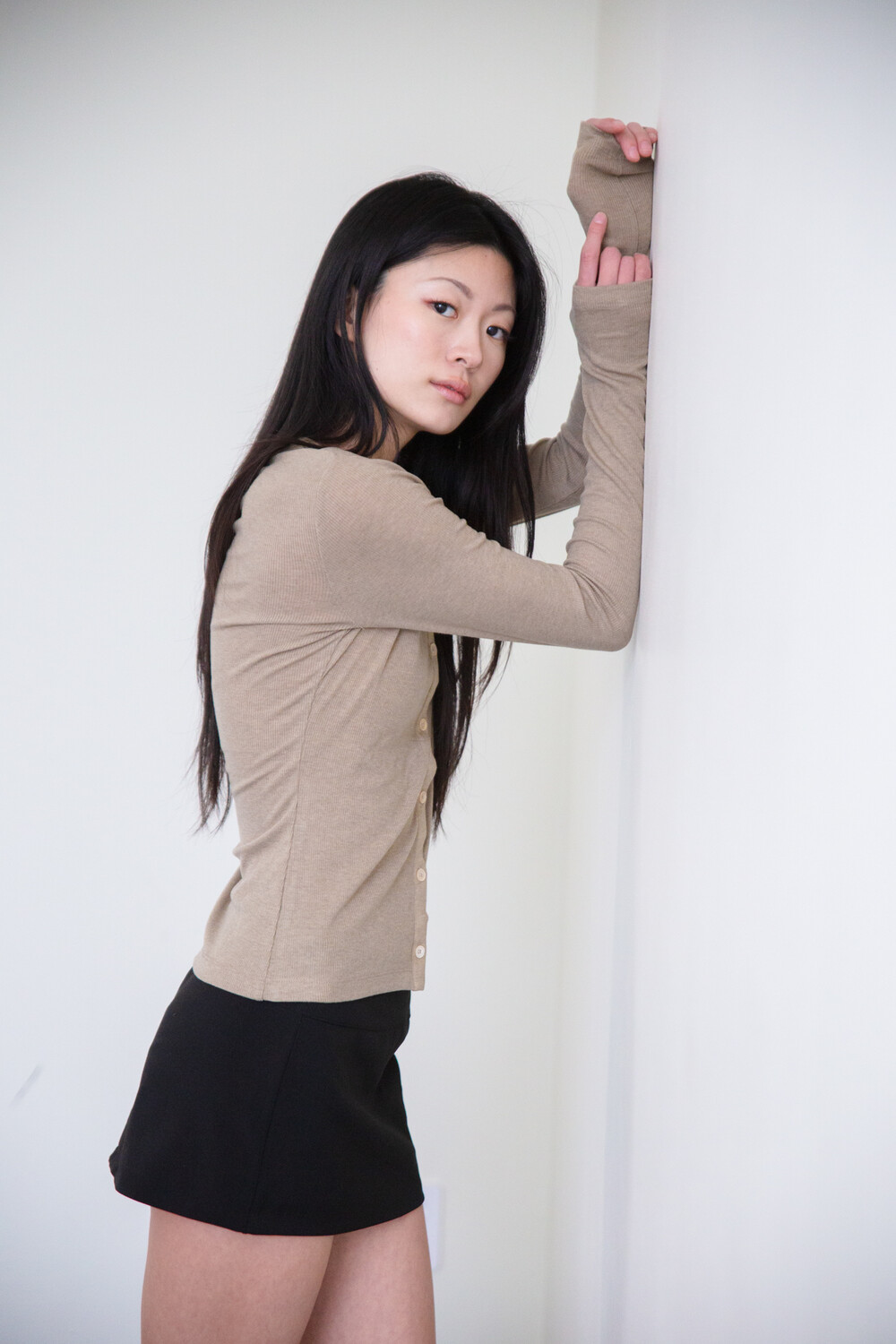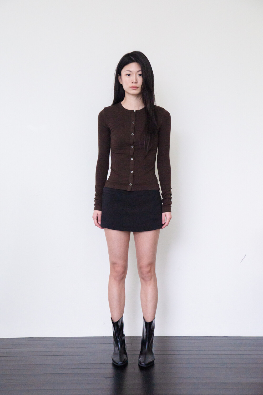 테어의 시그니처 감성과 뉴트럴 무드를 담아낸 Wool Tencel Ribbed Button Top은