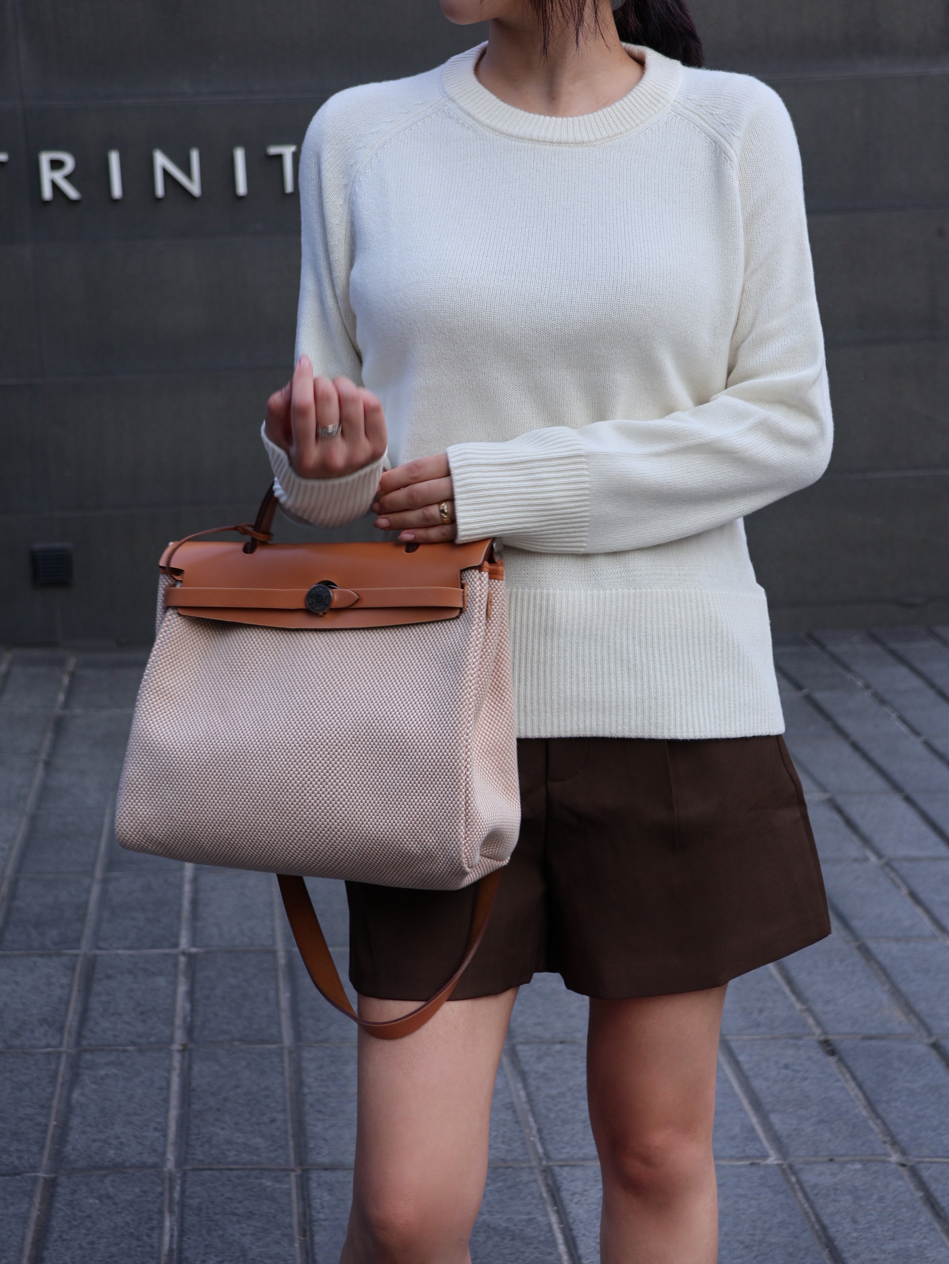 도톰한 두께감의 순수 캐시미어 원사로 제작된 자체제작 니트.